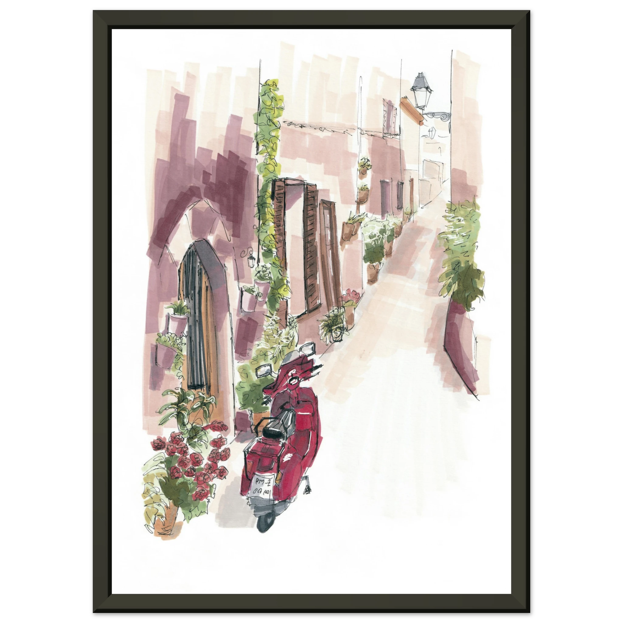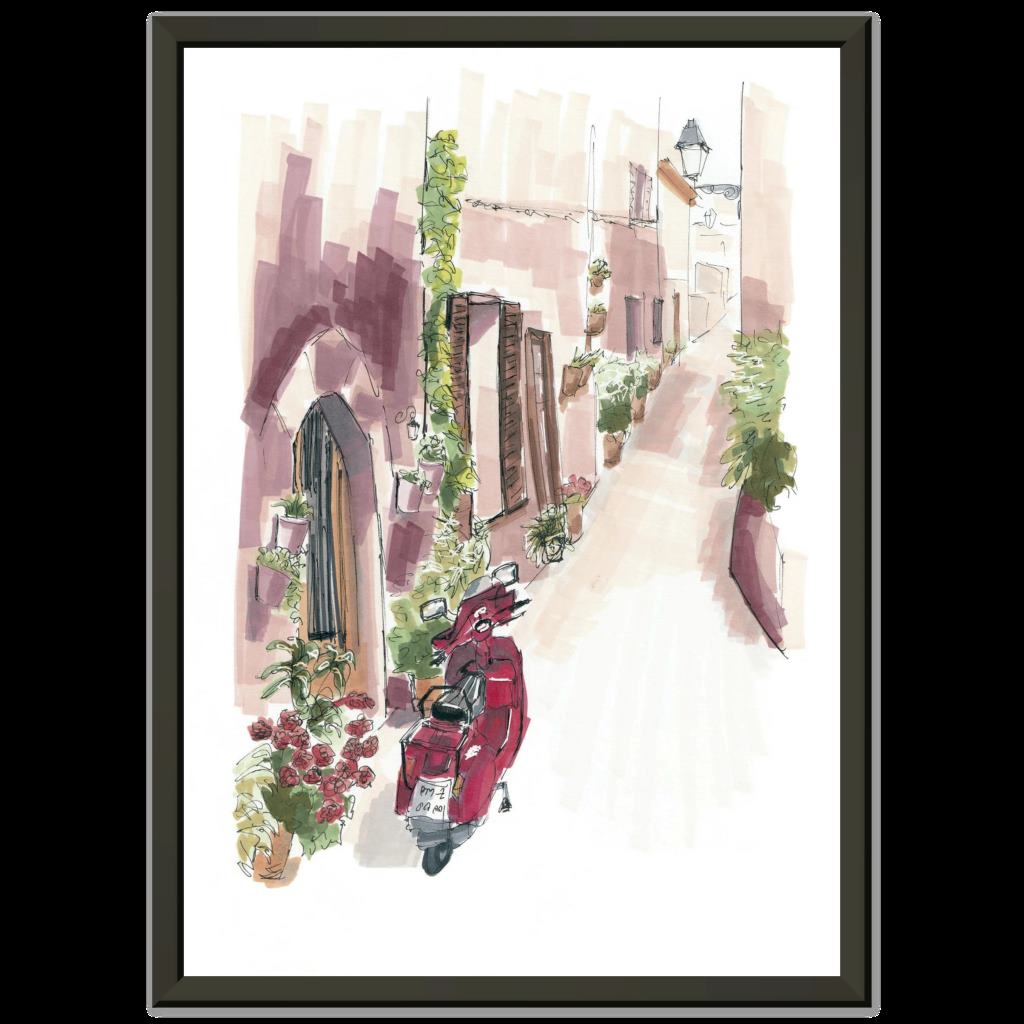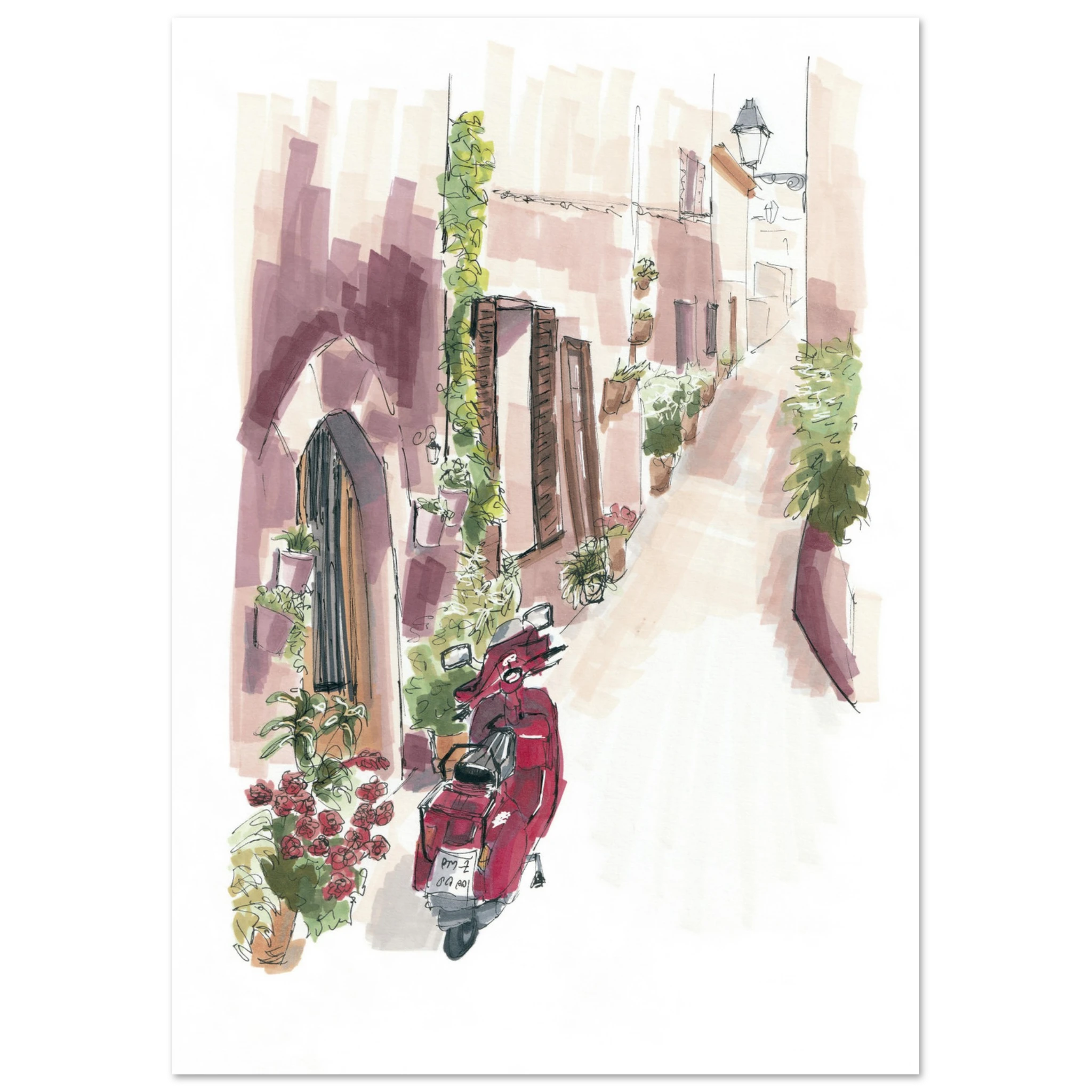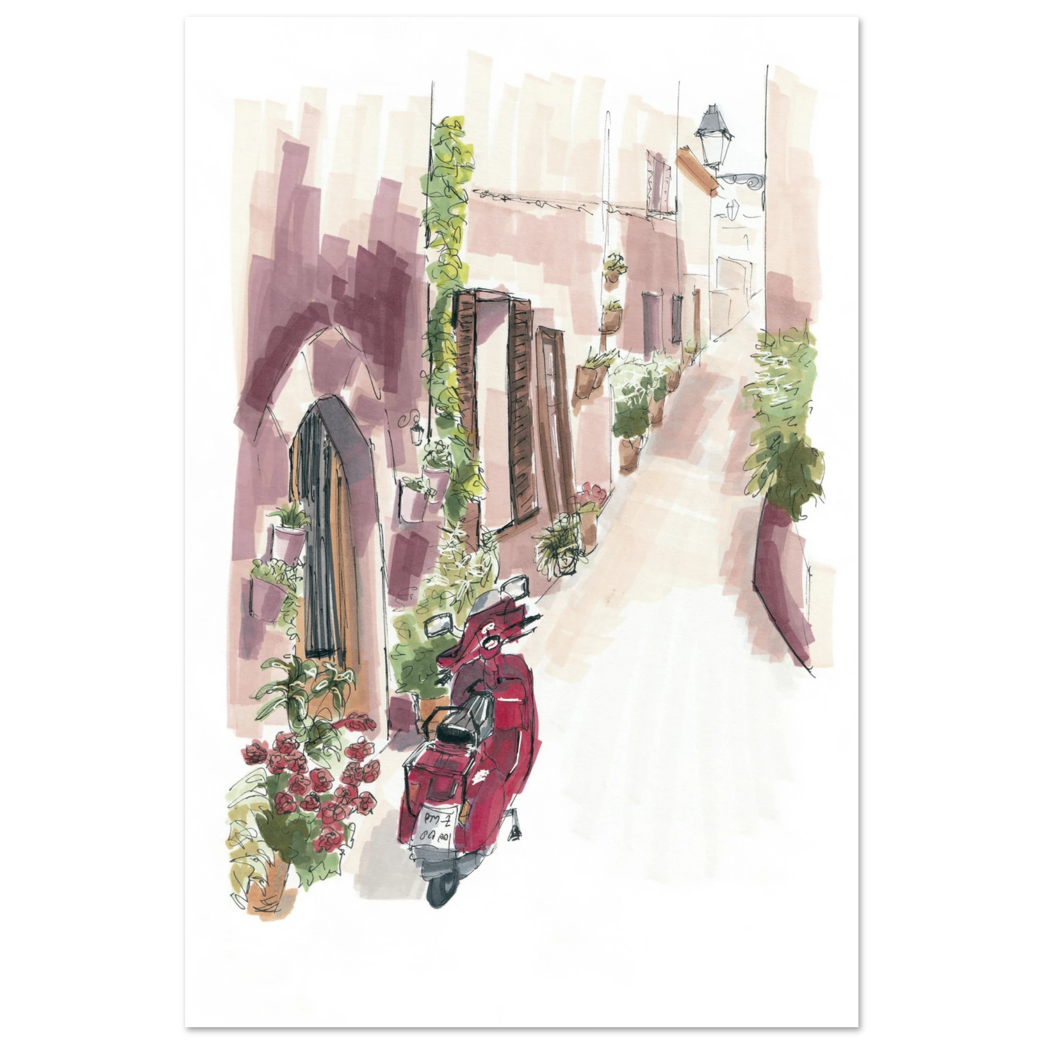 Impresión de gran calidad de una calle con una vespa roja, en Italia. Es una copia del original pintado a mano con rotuladores de alcohol.