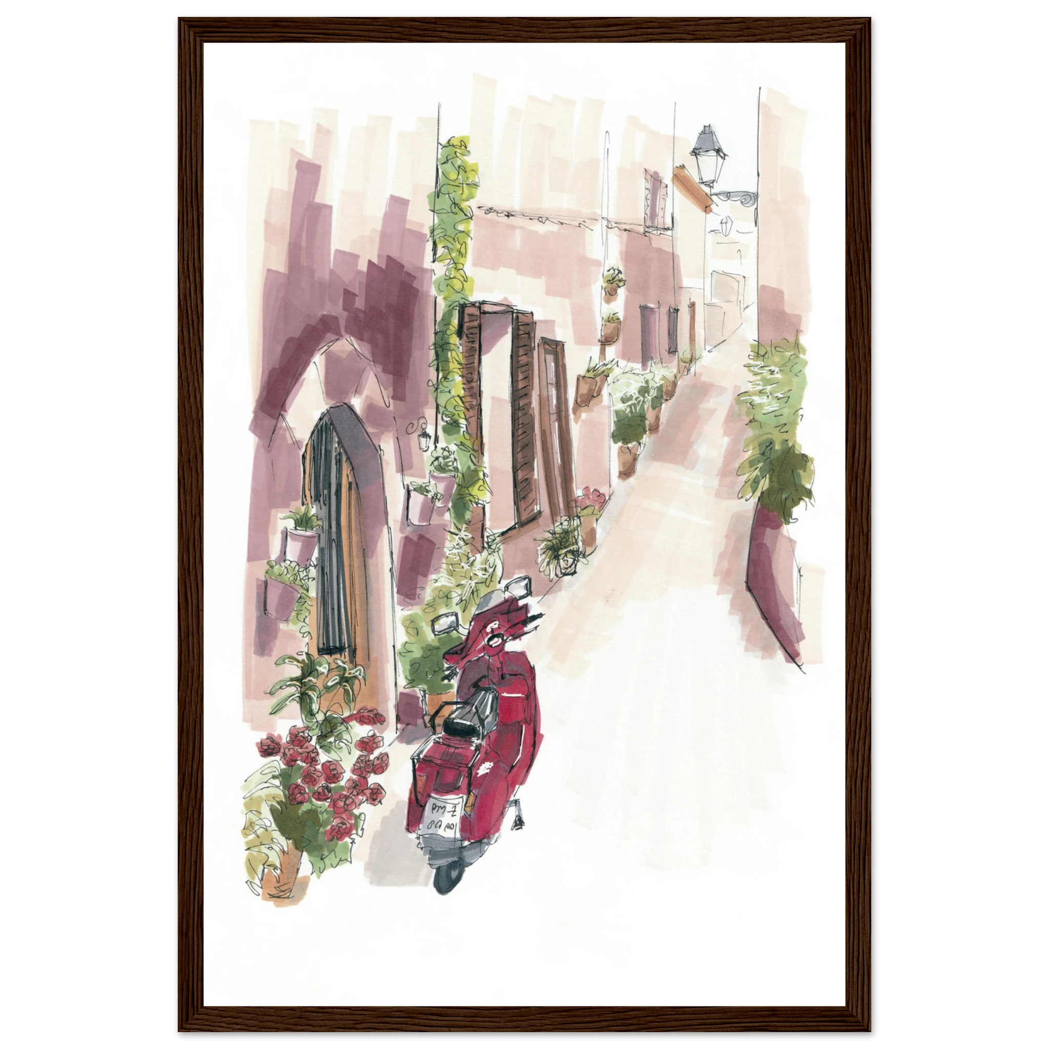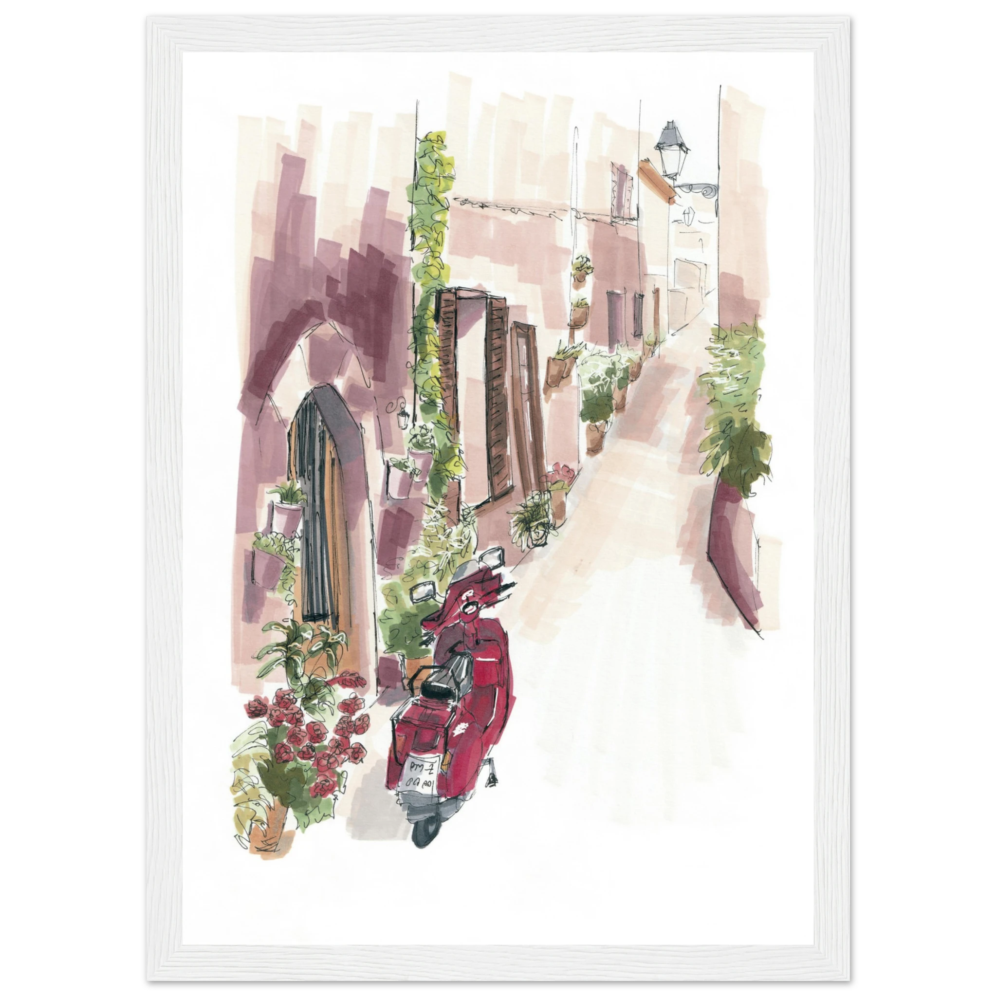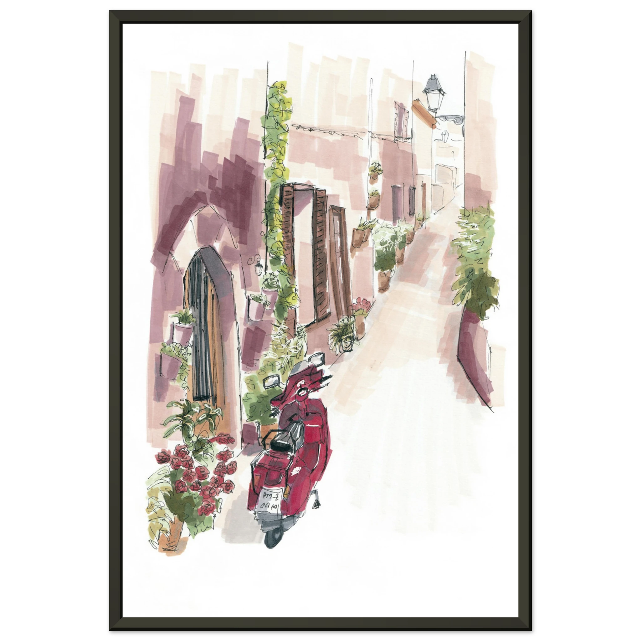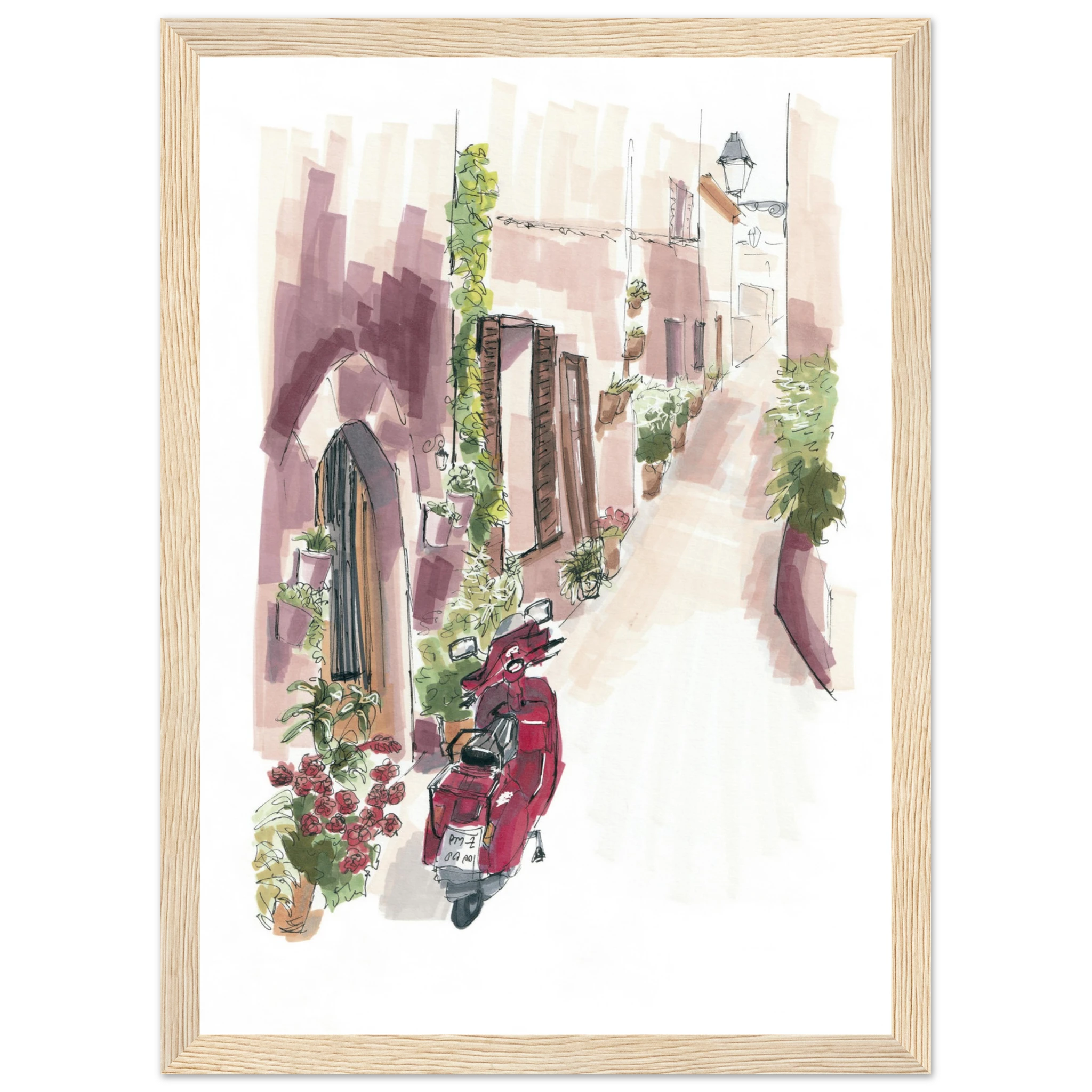 Impresión de gran calidad de una calle con una vespa roja, en Italia. Es una copia del original pintado a mano con rotuladores de alcohol.